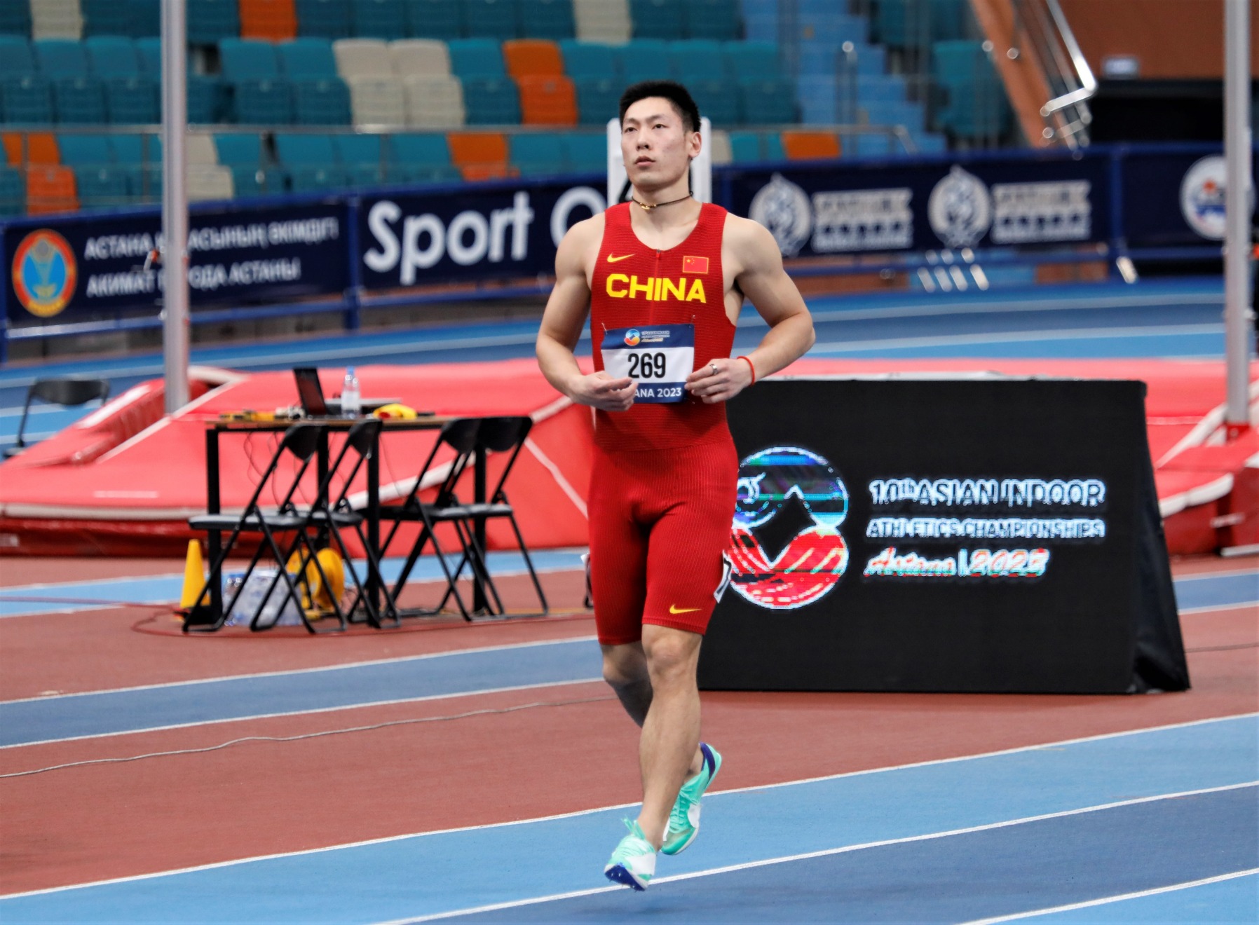 2月11日,2023亚洲室内田径锦标赛在哈萨克斯坦首都阿斯塔纳举行。中国选手石雨豪(中)在男子60米决赛中排名第六。新华社发(奥斯帕诺夫摄)